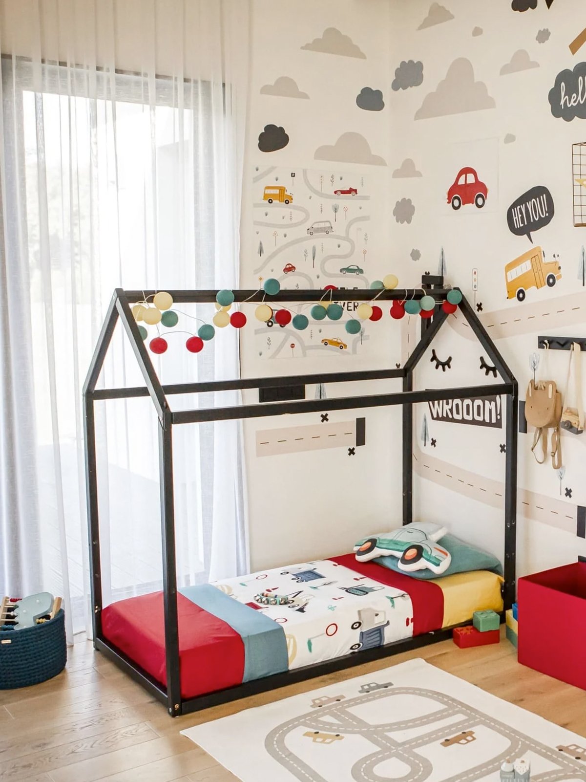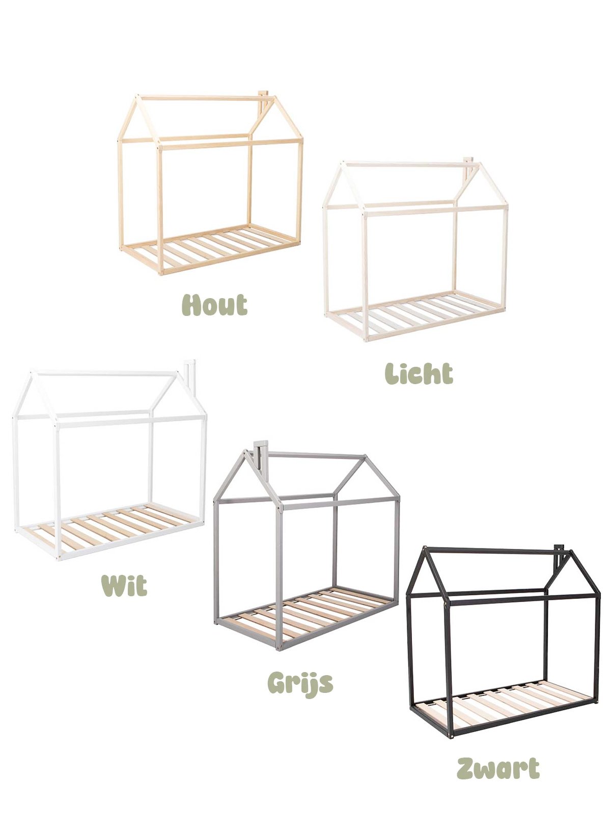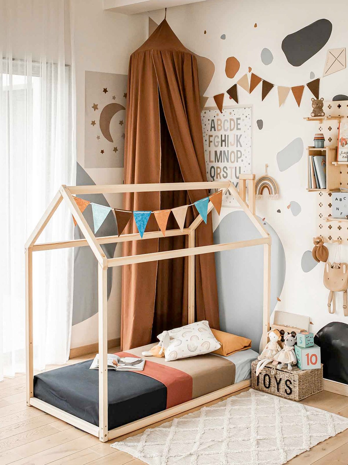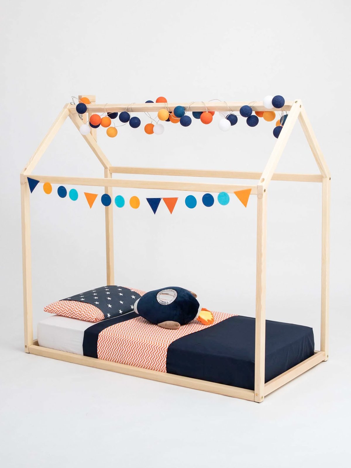 Het huisbed combineert stijl met veiligheid: de lage ligging maakt vallen vrijwel onmogelijk en het stevige houten frame zorgt voor een geruststellende, comfortabele slaap. Voeg wat lampjes, een klamboe of zachte kussens toe en er ontstaat een magisch slaapplekje waar jouw kind zich helemaal thuis voelt.