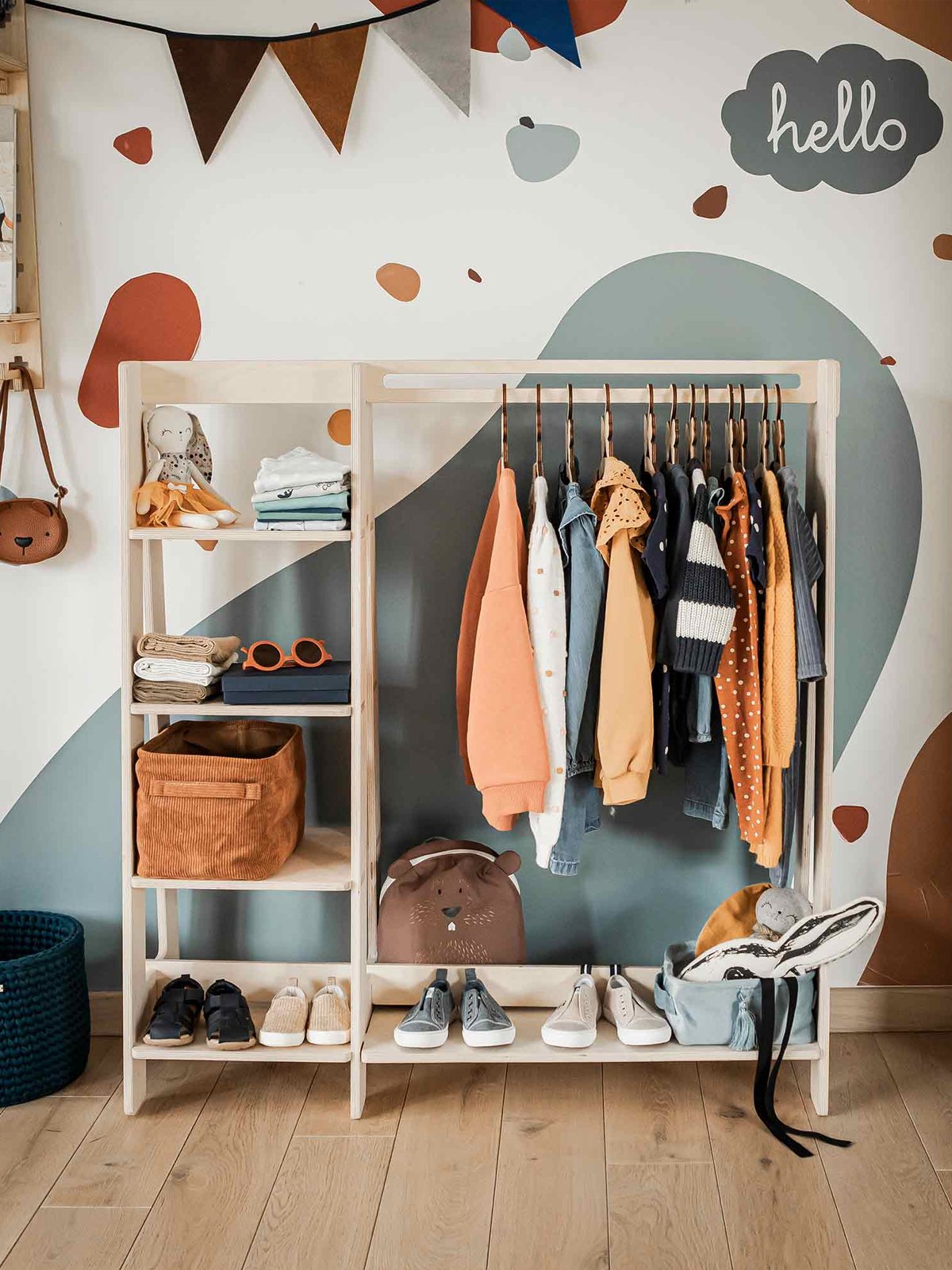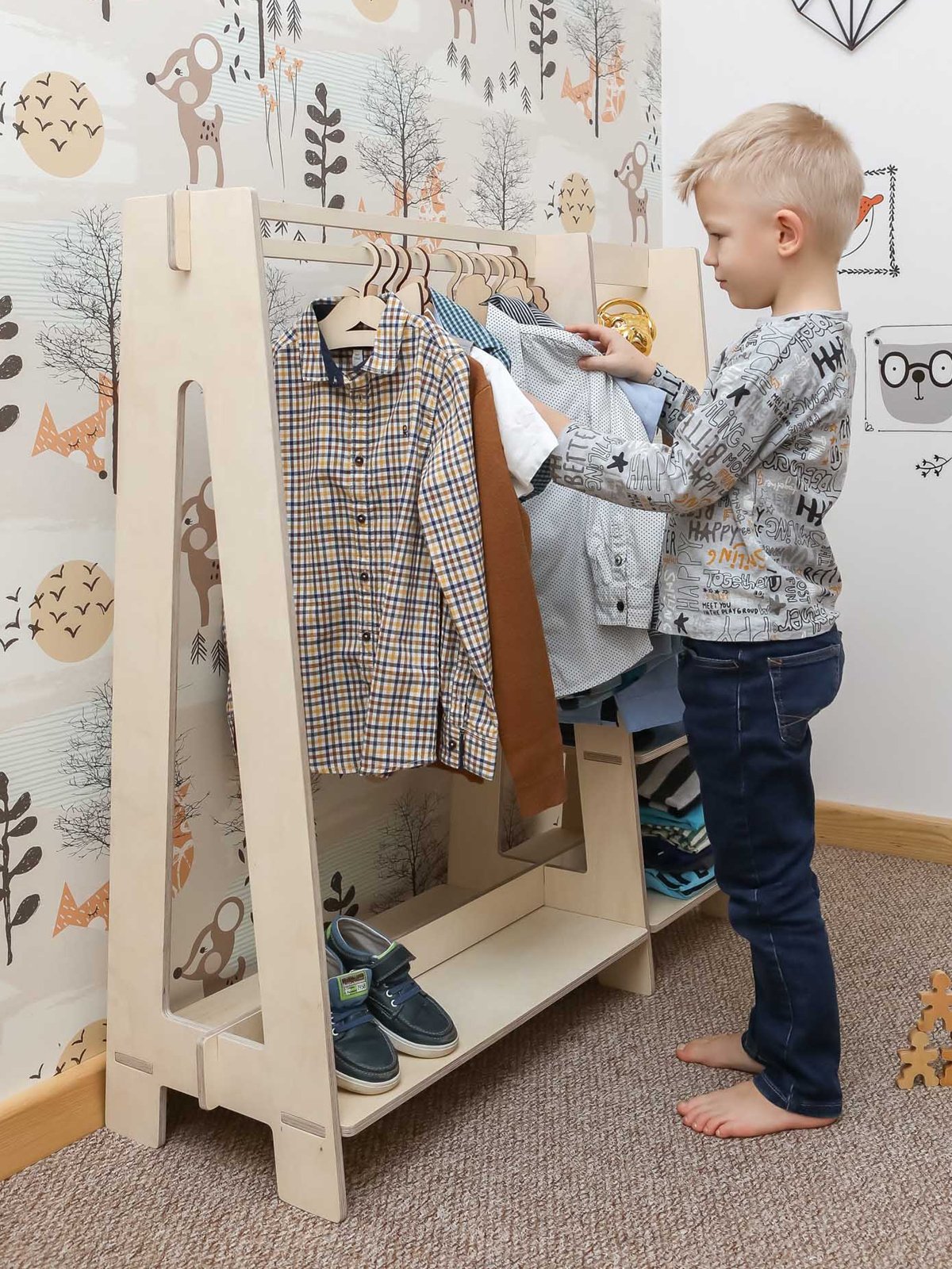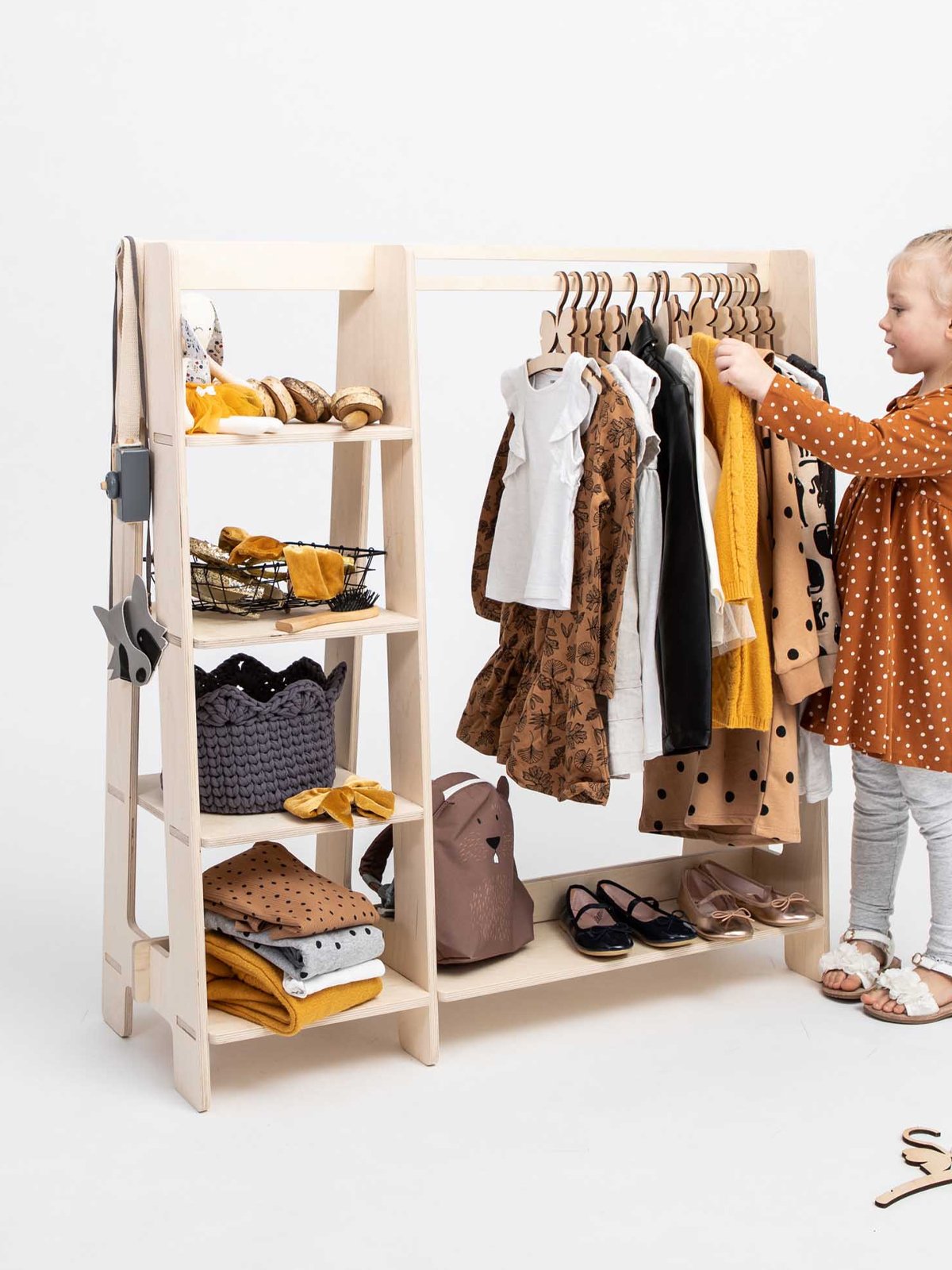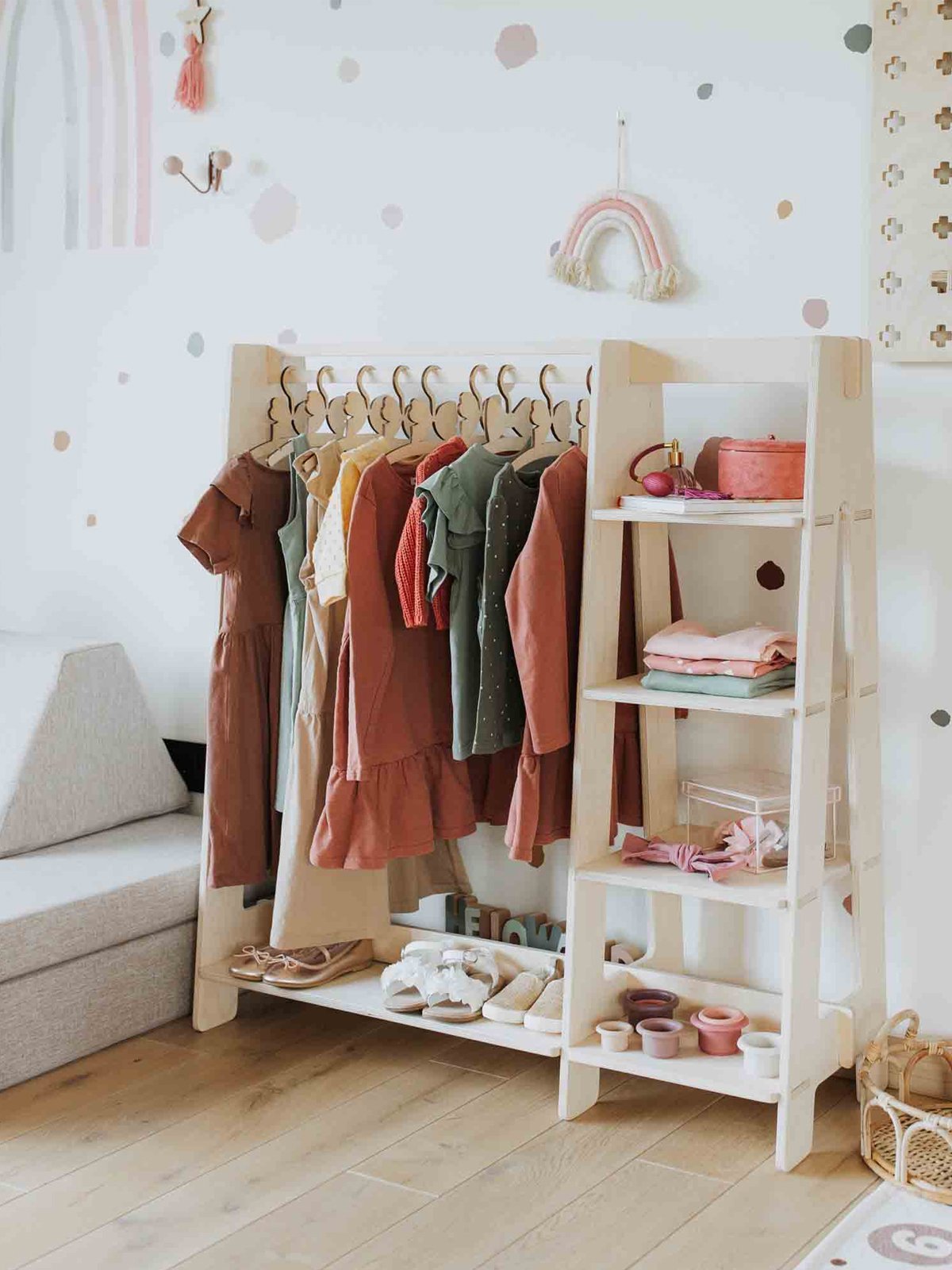 Ontdek deze prachtige Montessori-geïnspireerde kinderkledingkast, ontworpen om kleintjes zelfstandig hun kleding te laten kiezen en opbergen. De speelse A-frame vorm, vervaardigd uit hoogwaardig berkenmultiplex, geeft de kamer een warme en natuurlijke uitstraling.
