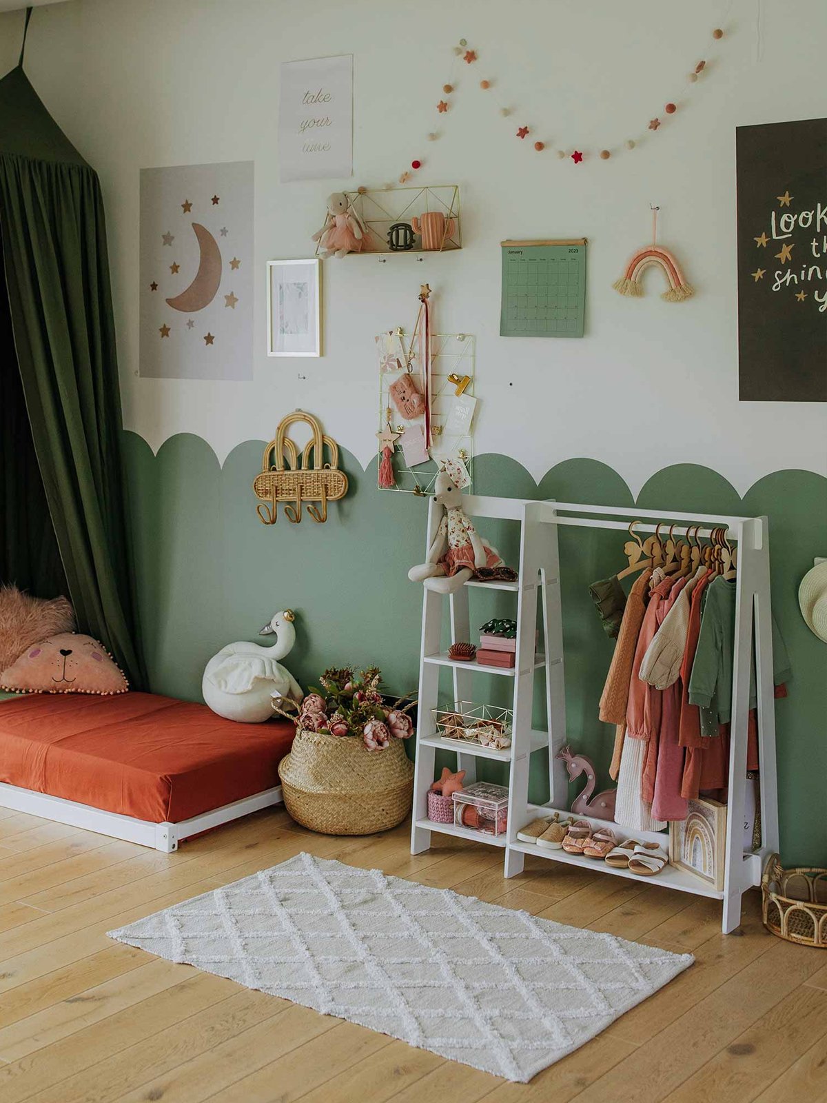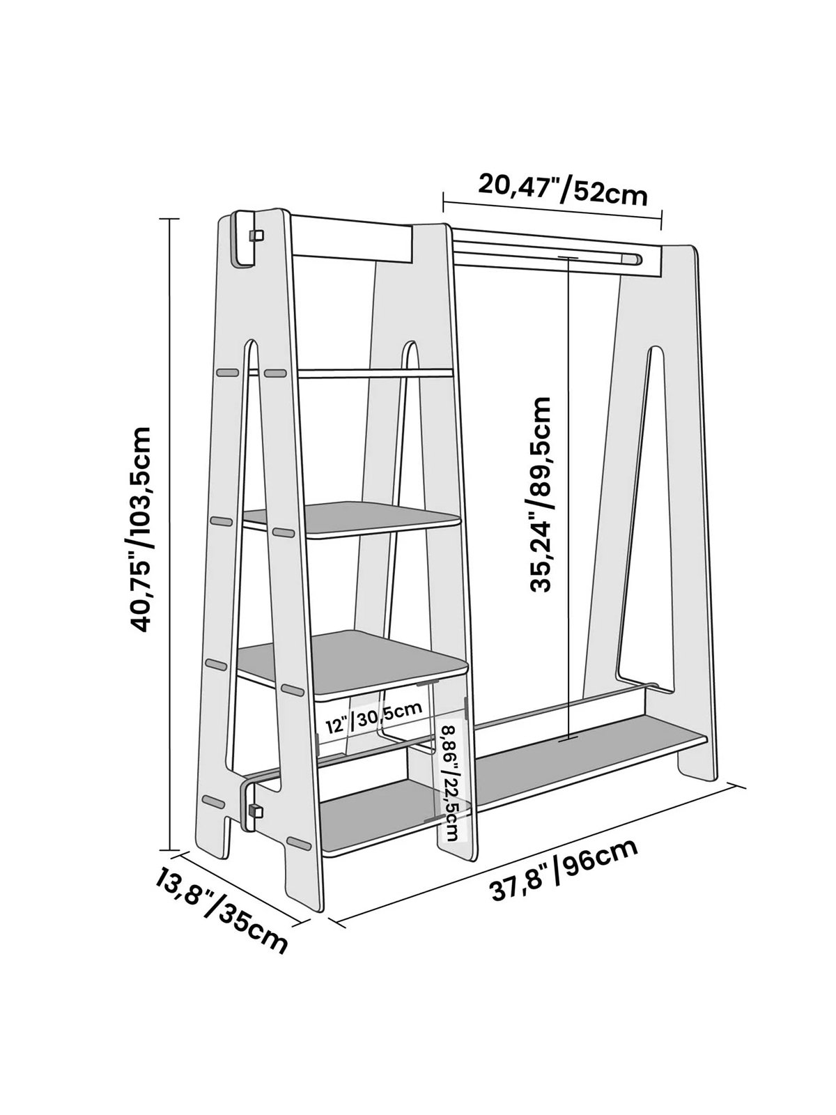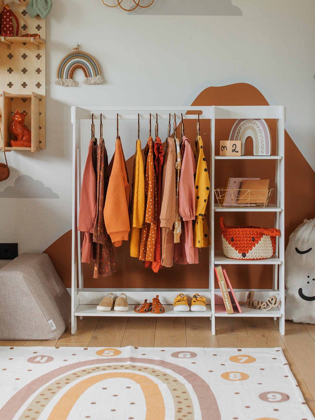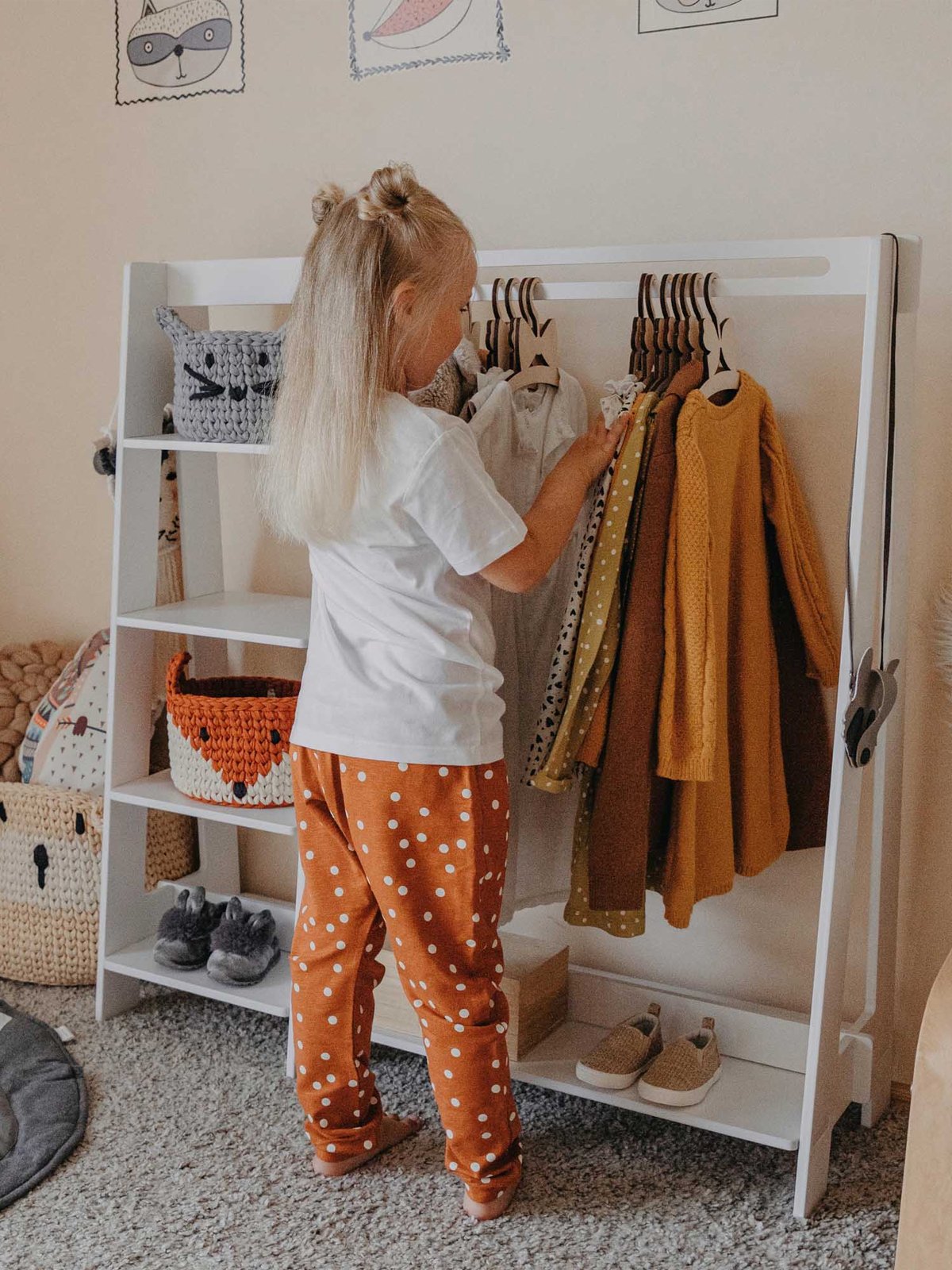 Ontdek deze prachtige Montessori-geïnspireerde kinderkledingkast, ontworpen om kleintjes zelfstandig hun kleding te laten kiezen en opbergen. De speelse A-frame vorm, vervaardigd uit hoogwaardig berkenmultiplex, geeft de kamer een warme en natuurlijke uitstraling.