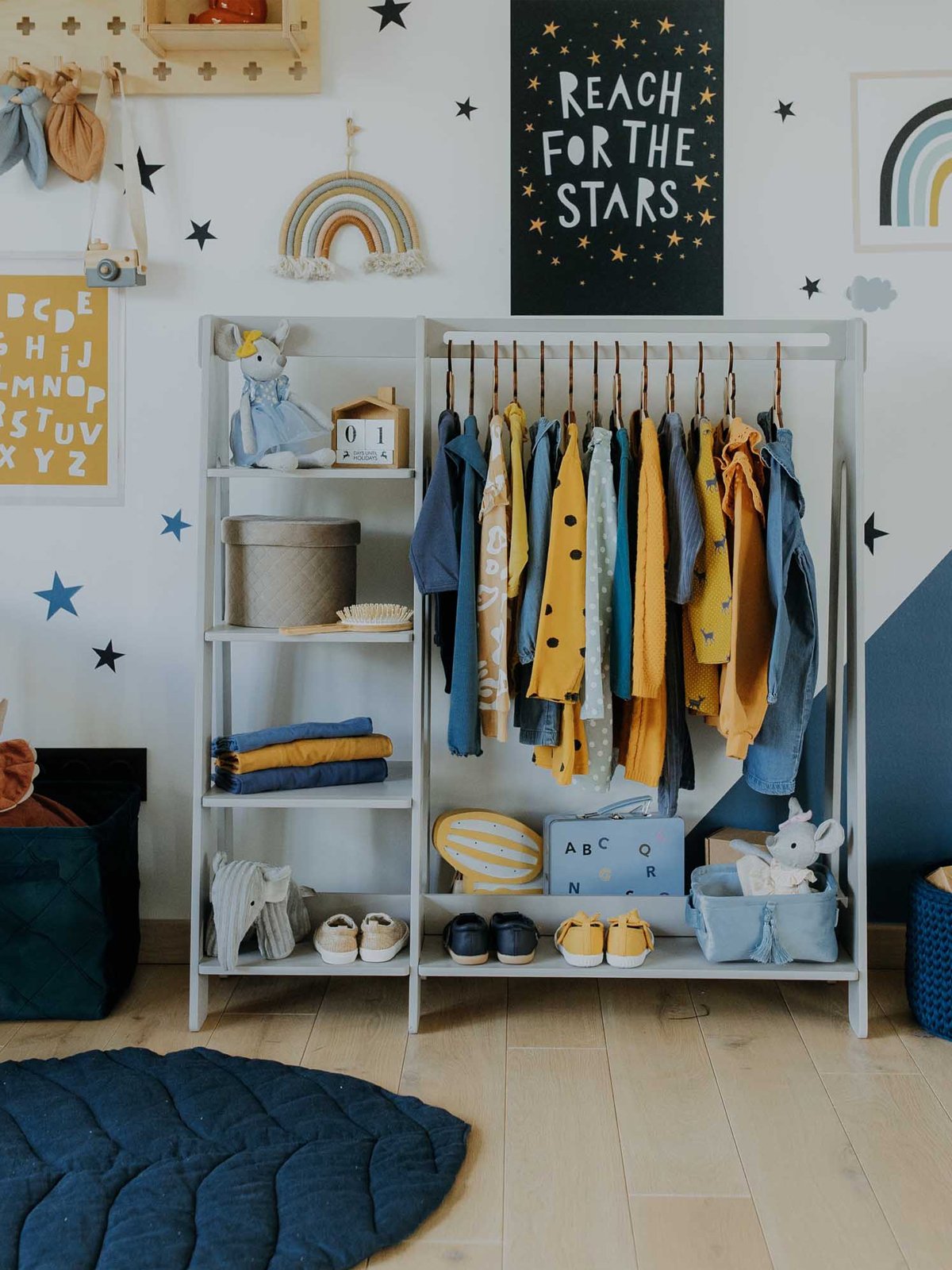 Dankzij de handige opbergplanken en het toegankelijke ontwerp is deze kast precies op kinderformaat. Perfect voor het netjes organiseren van baby- en kinderkleding, maar ook ideaal als multifunctioneel meubelstuk in de speel- of kinderkamer. Een stijlvolle combinatie van spelen, leren en opbergen!