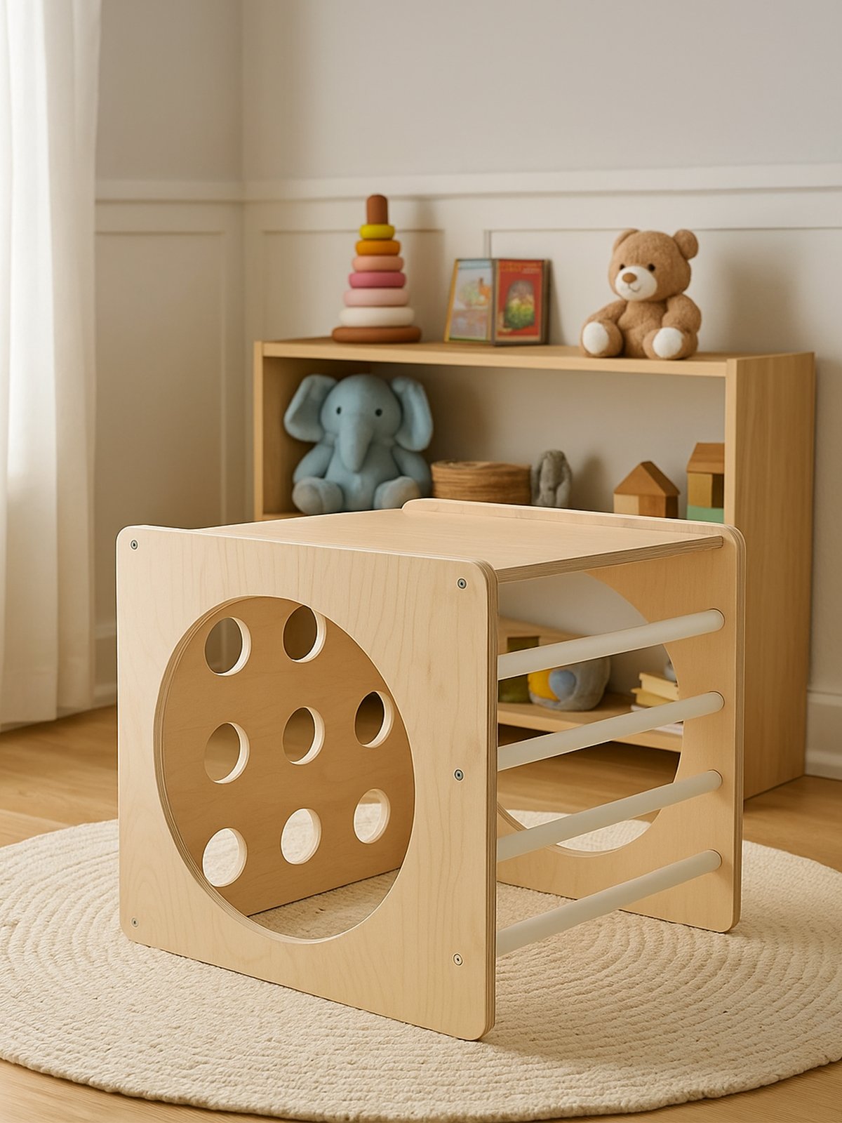 Of het nu in de speelkamer, woonkamer of kinderkamer staat – deze stijlvolle klimkubus past naadloos in elk modern interieur.