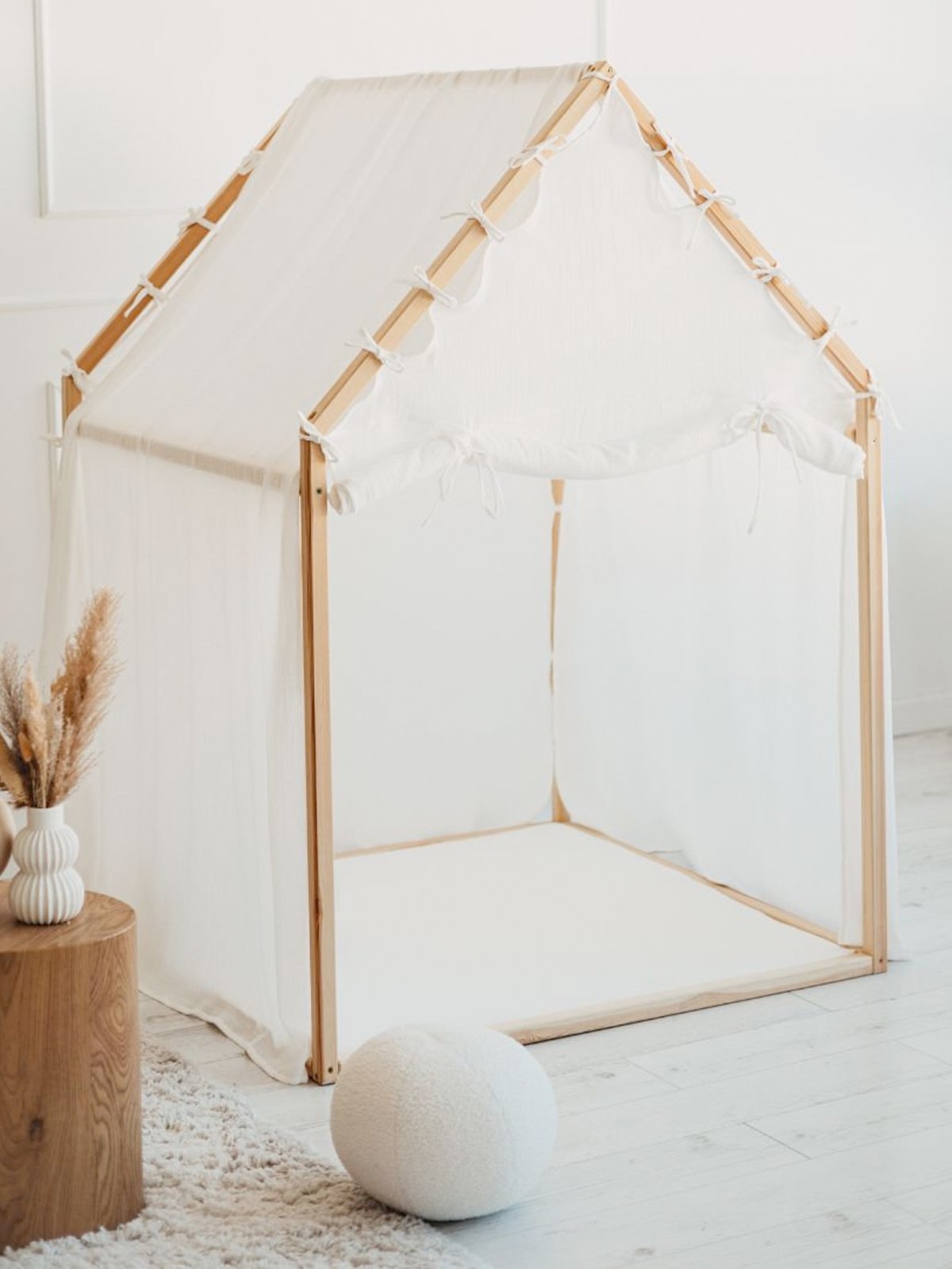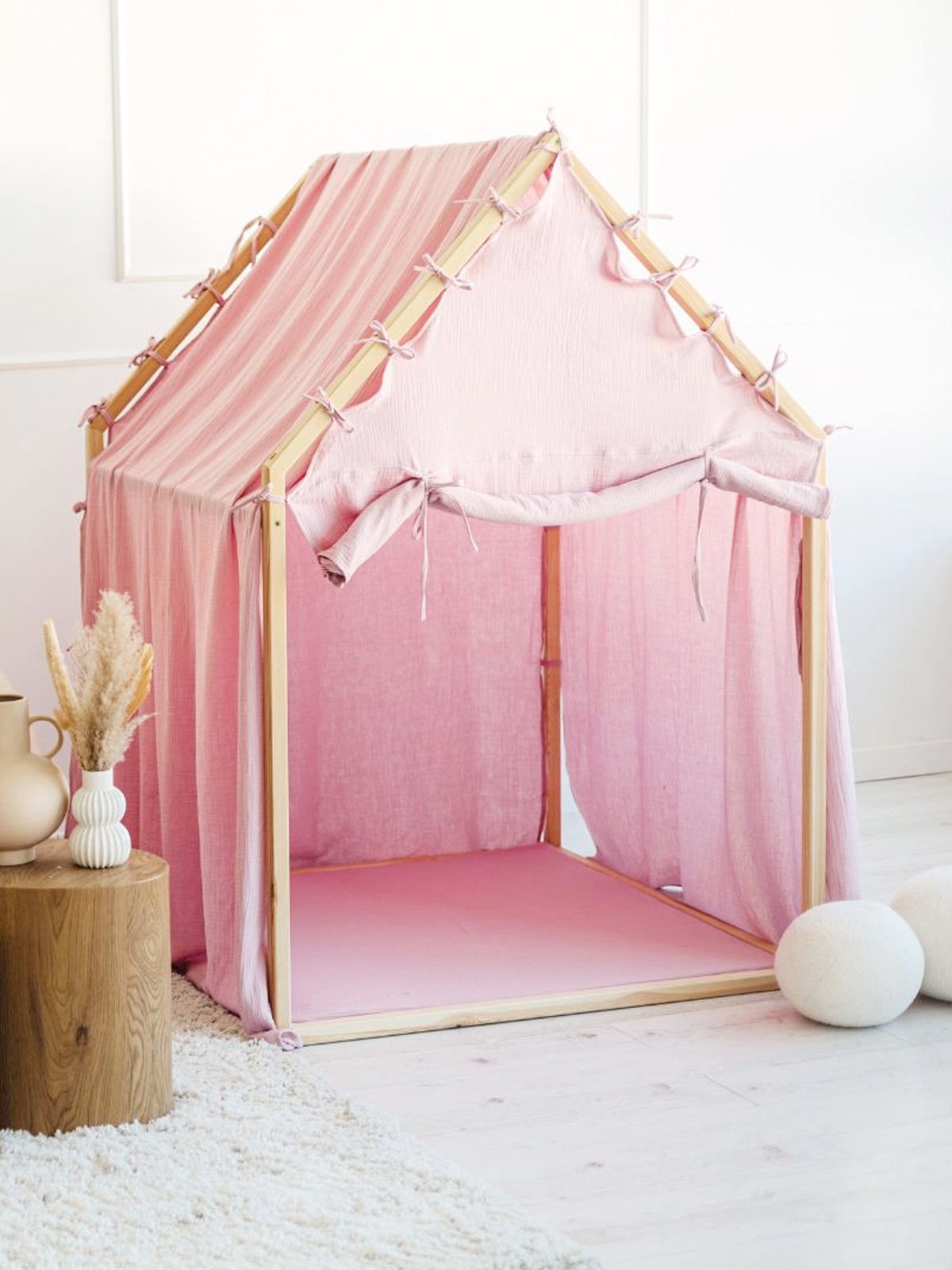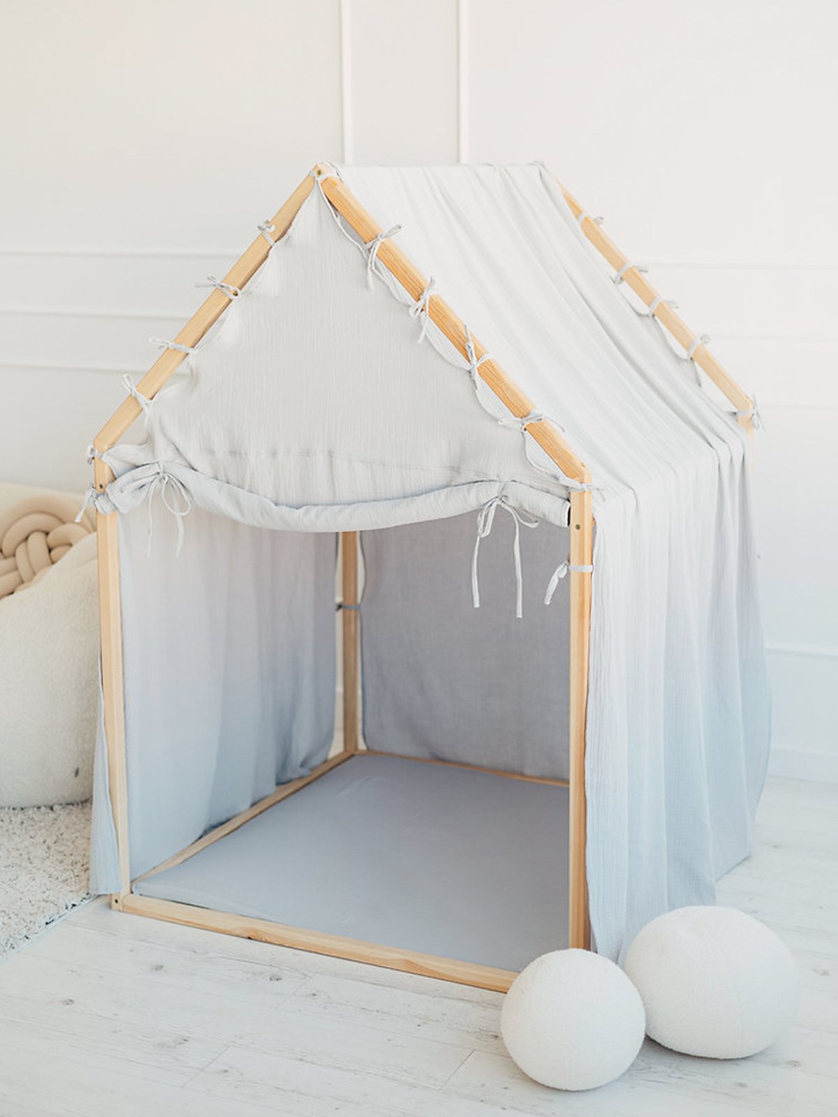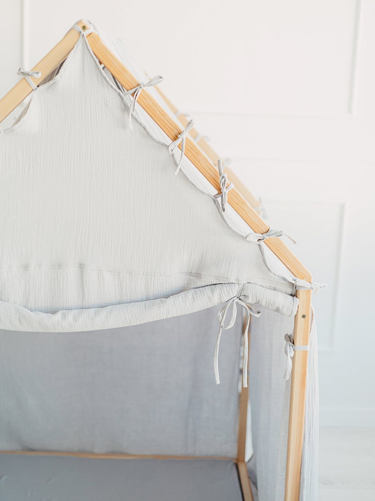 Het schuine dak en de zachte lijnen creëren een warme, geborgen sfeer die uitnodigt tot urenlang fantasierijk spel. De luchtige cover is vervaardigd uit 100% mousseline katoen (Oeko-Tex 100 gecertificeerd) en valt los over het dak tot op de grond, wat het geheel een elegante, natuurlijke uitstraling geeft.