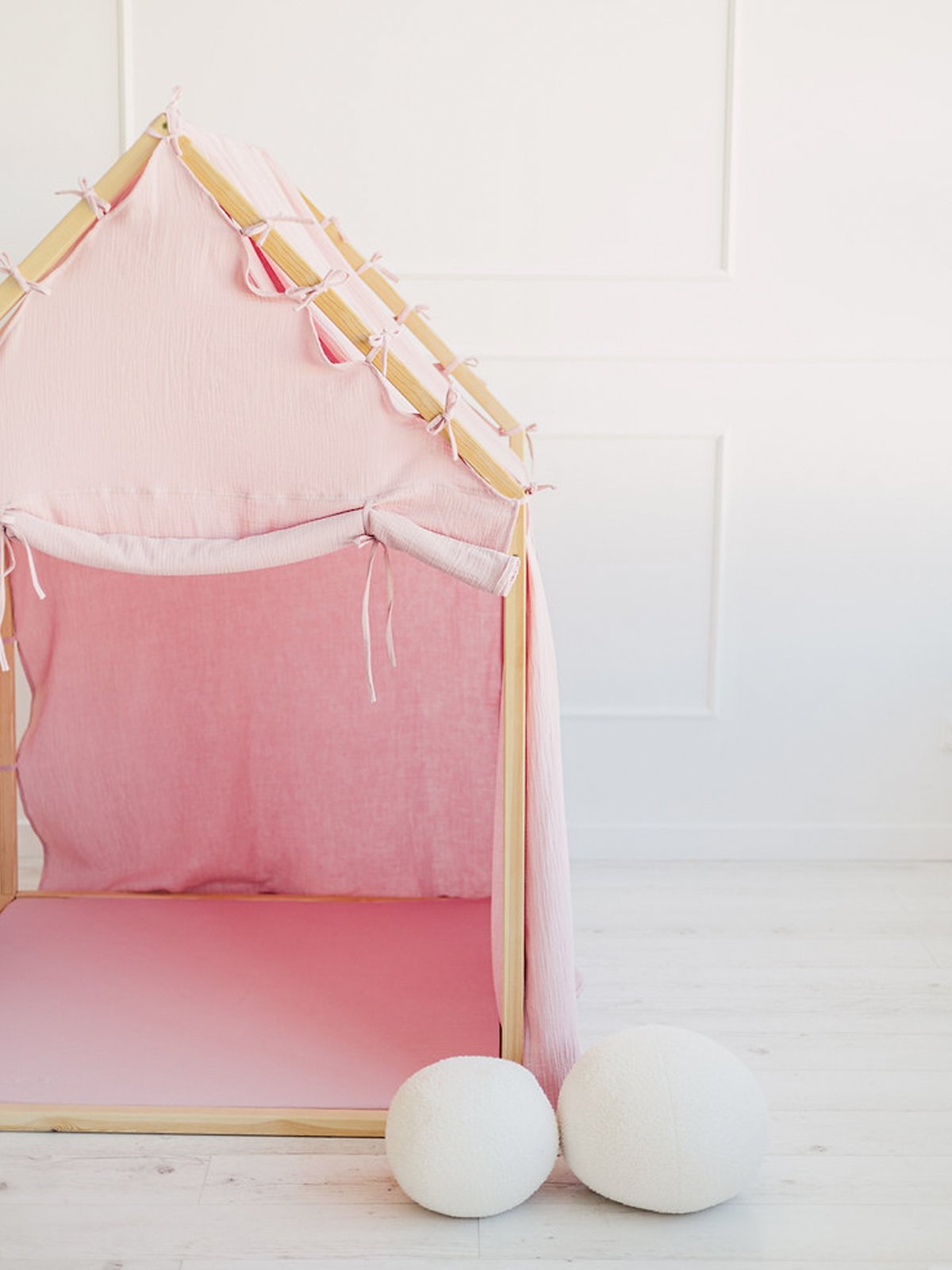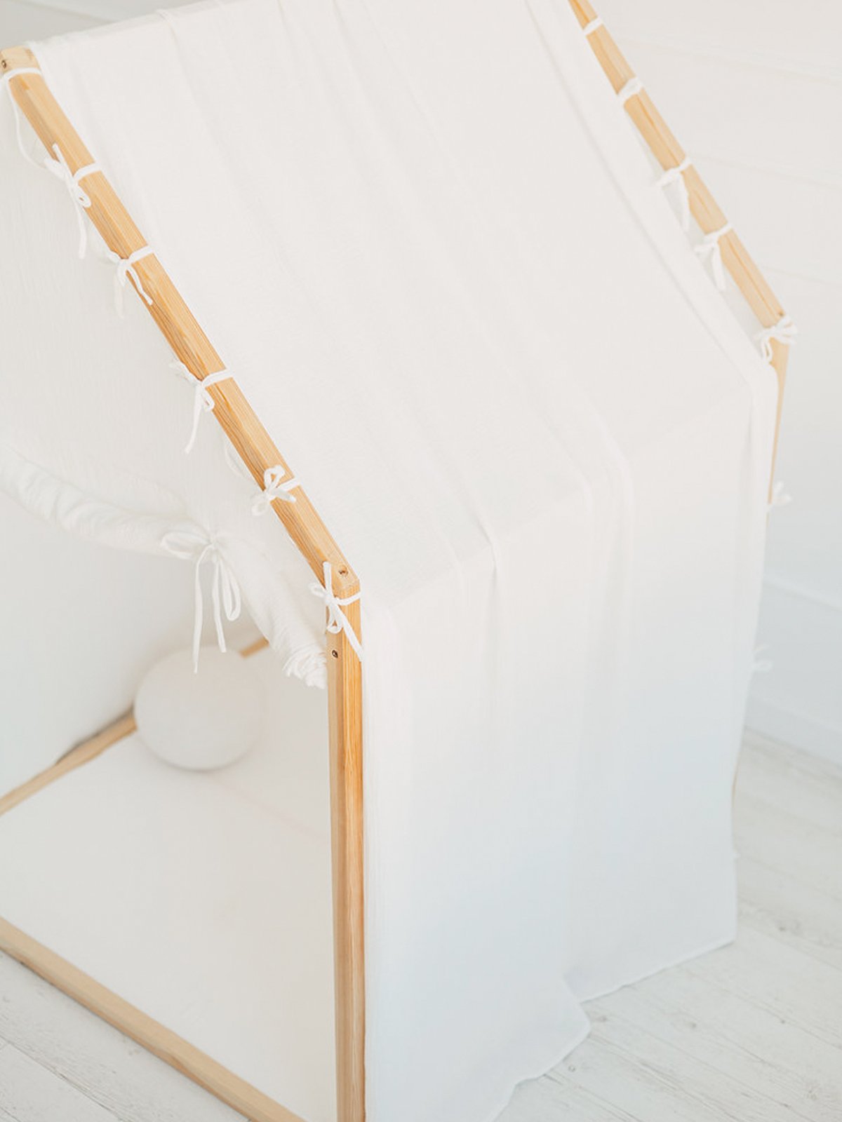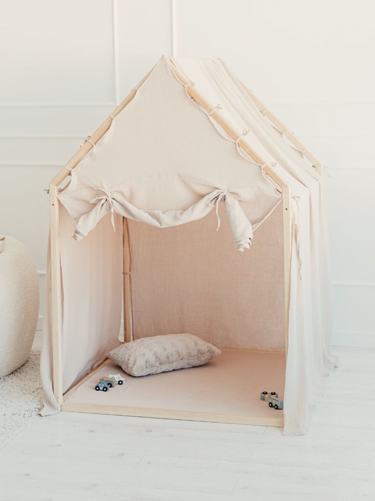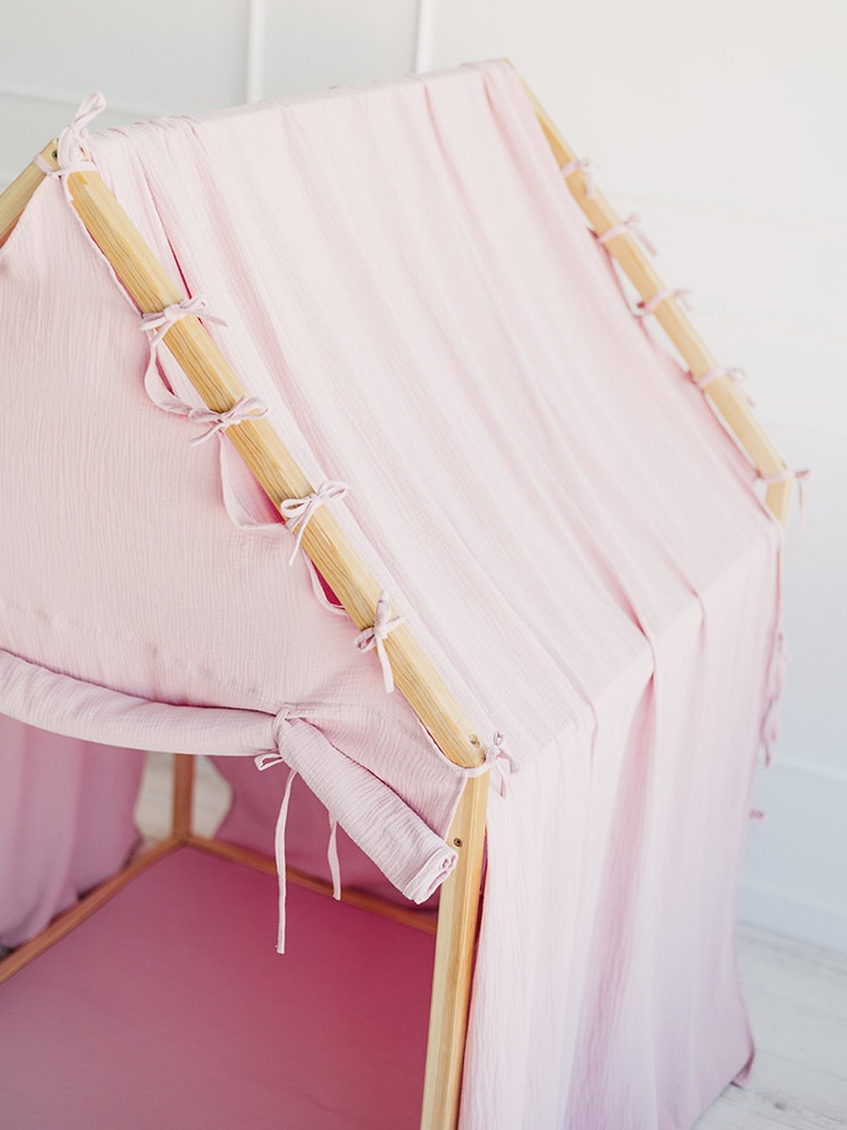Het schuine dak en de zachte lijnen creëren een warme, geborgen sfeer die uitnodigt tot urenlang fantasierijk spel. De luchtige cover is vervaardigd uit 100% mousseline katoen (Oeko-Tex 100 gecertificeerd) en valt los over het dak tot op de grond, wat het geheel een elegante, natuurlijke uitstraling geeft.