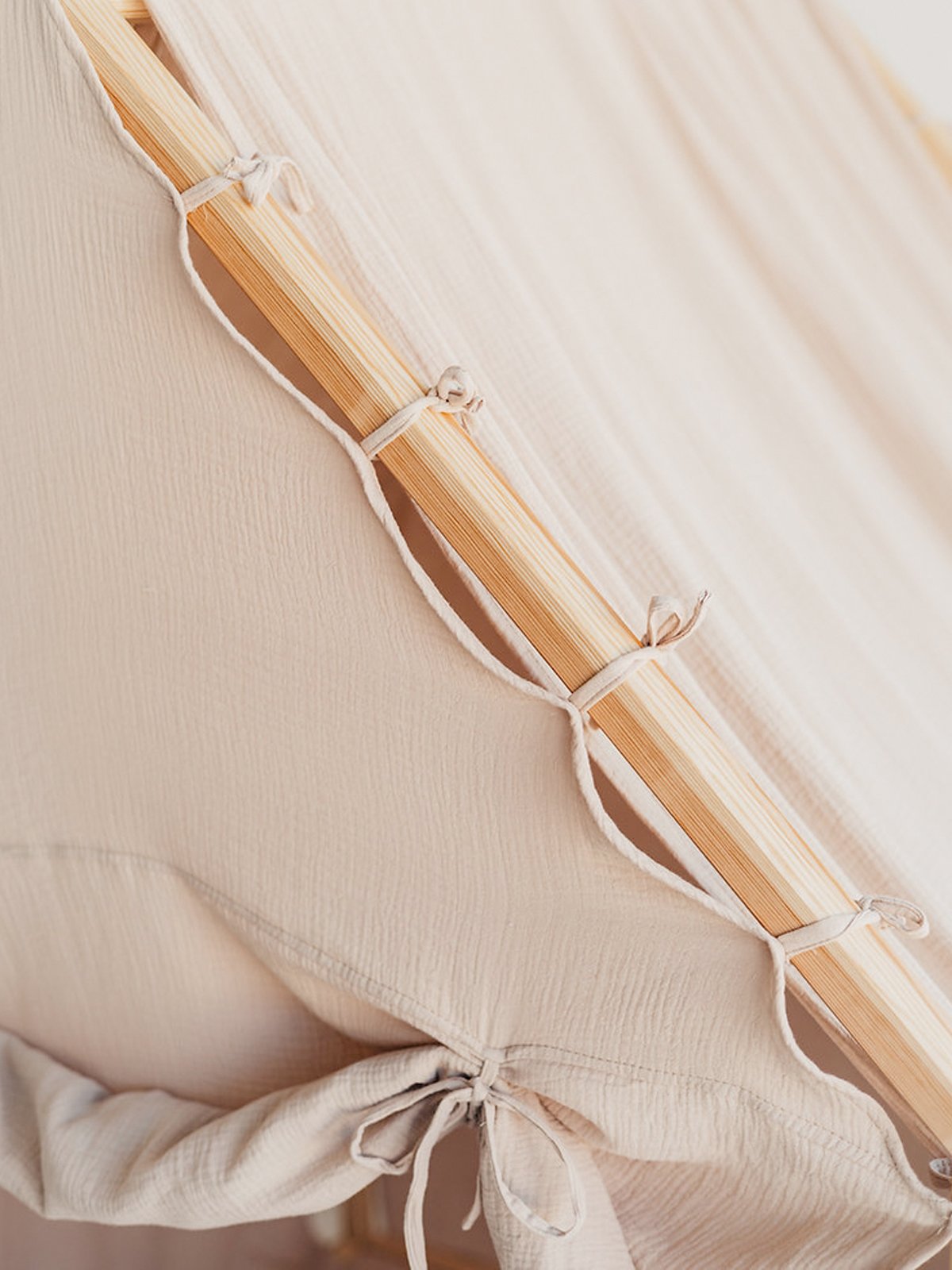 Houten frame met afgeronde hoeken en mousseline katoen met Oeko-Tex 100 certificering.
