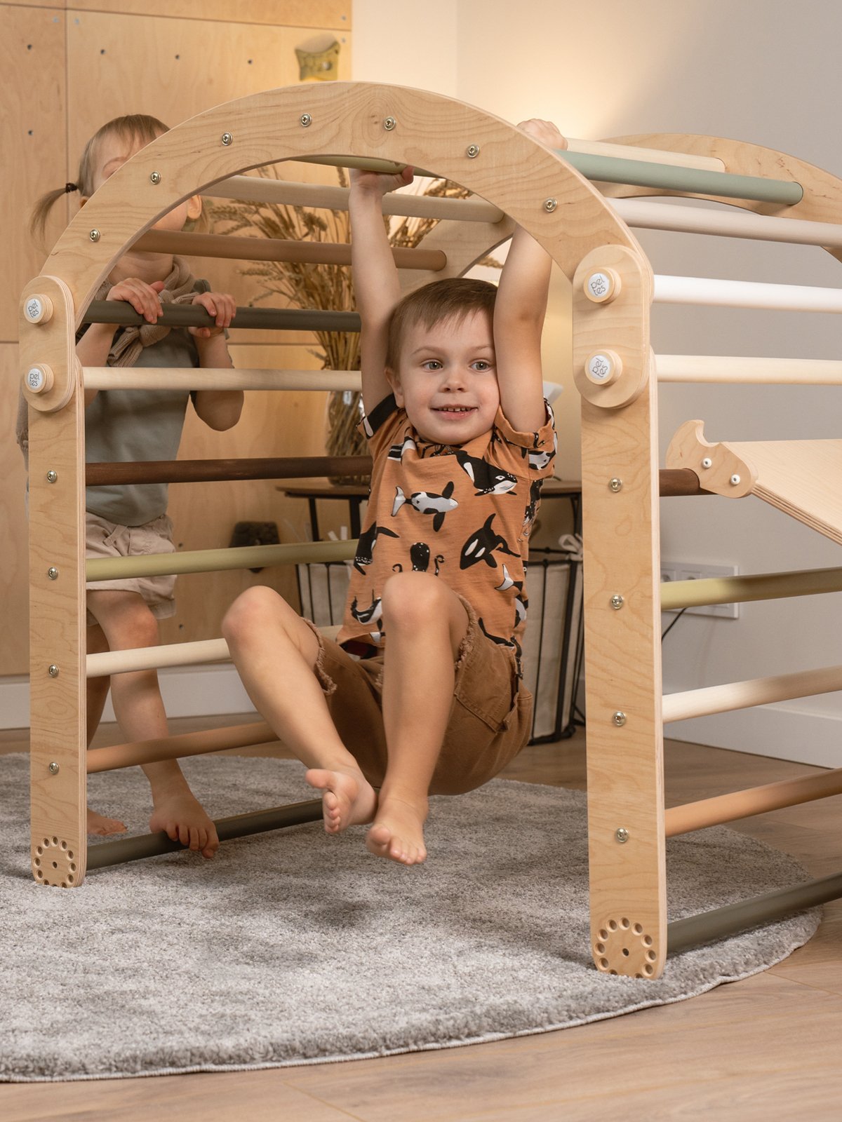 Of het nu in de speelkamer, woonkamer of kinderkamer staat – deze stijlvolle klimset past naadloos in elk modern interieur.