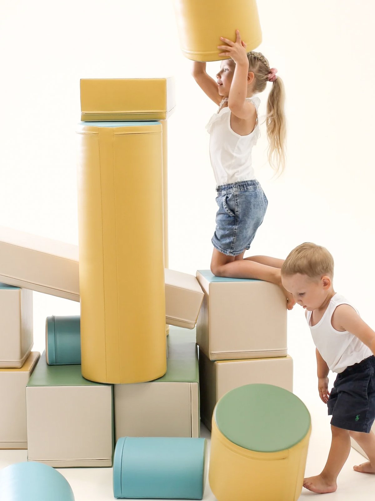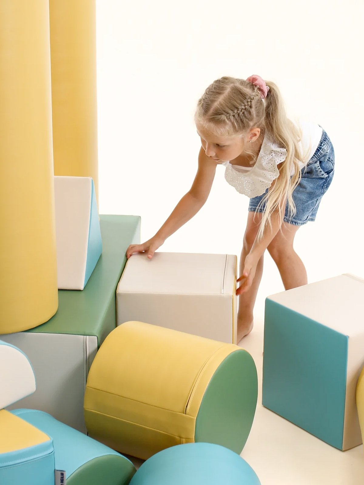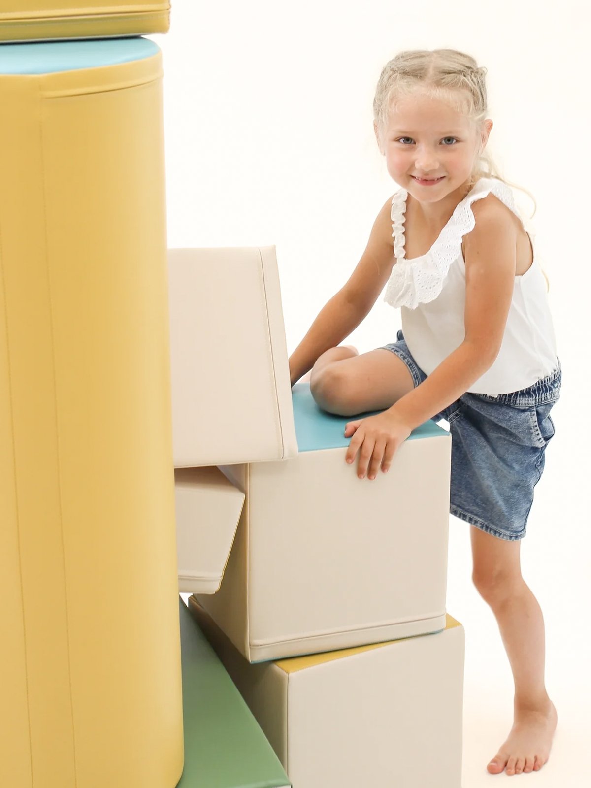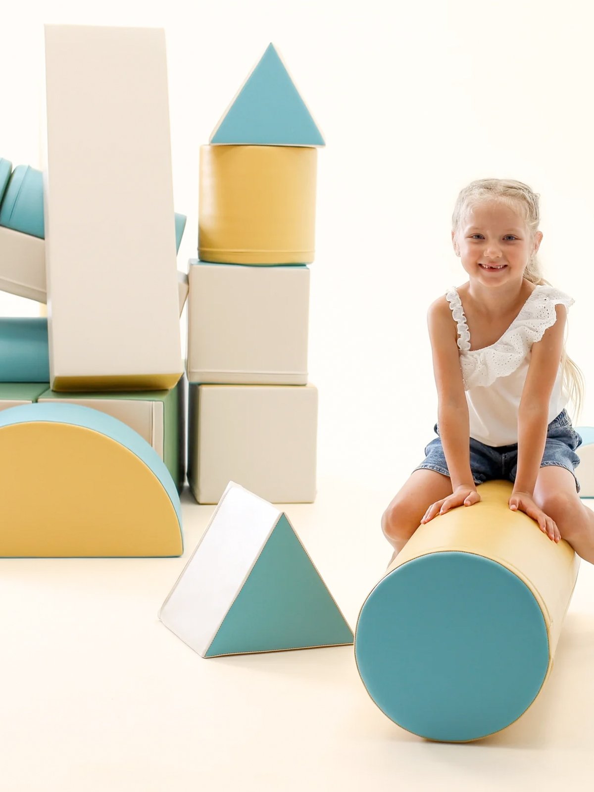 De soft play set zijn gemaakt van stevig, hoogwaardig 100% recyclebaar foam met een gesloten celstructuur – zacht én superlicht. Ze zijn bekleed met sterk, milieuvriendelijk kunstleer dat prettig aanvoelt en eenvoudig te reinigen is.